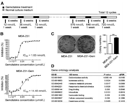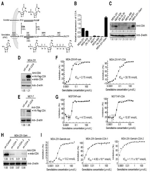 基于以上mRNA表達(dá)譜芯片分析發(fā)現(xiàn)一些重要的吉西他濱代謝酶主要集中于一個(gè)代謝通路中。其中能夠通過脫氨基作用失活吉西他濱的CDA在MDA-231-Gem細(xì)胞中上調(diào)。此外,CDA在MDA-231和MDA-436表達(dá),但是在MCF7, ZR-75-30 ,MDA-468, and Hs-578T細(xì)胞系中幾乎不表達(dá)。而與芯片分析結(jié)果一致,CDA在MDA-231-Germ與其他細(xì)胞系相比高表達(dá)。細(xì)胞毒性實(shí)驗(yàn)表明,過表達(dá)CDA的乳腺癌細(xì)胞系具有更高的IC50值。抑制CDA表達(dá)能夠降低乳腺癌細(xì)胞系對(duì)吉西他濱的藥物抗性。以上結(jié)果表明CDA表達(dá)與乳腺癌細(xì)胞系對(duì)于吉西他濱治療敏感性非常相關(guān)。
