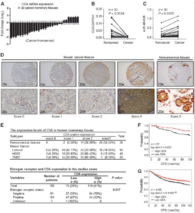 qPCR對(duì)30對(duì)樣本檢測(cè),發(fā)現(xiàn)原發(fā)性乳腺癌比其配對(duì)癌旁中CDA表達(dá)頻繁顯著下調(diào),而miR-484剛好相反。對(duì)193原發(fā)乳腺癌樣本和36非癌control用IHC檢測(cè)CDA蛋白水平發(fā)現(xiàn)CDA在94.4%非癌組織中有很強(qiáng)的信號(hào),而在原發(fā)腫瘤中比例有所降低(40%)。此外,臨床特征分析表明CDA與乳腺癌ER狀態(tài)強(qiáng)烈相關(guān)。KM分析表明高CDA表達(dá)與長的DFS(disease-free survival)顯著相關(guān)。此外,CDA高表達(dá)使乳腺癌復(fù)發(fā)風(fēng)險(xiǎn)降低。以上結(jié)果表明CDA表達(dá)水平可以作為乳腺癌的預(yù)后marker。