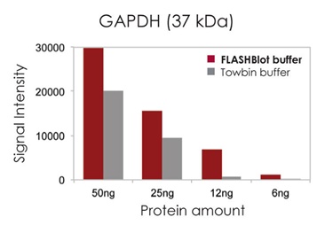 應(yīng)用FLASHBlot和Towbin轉(zhuǎn)印緩沖液轉(zhuǎn)印Transferrin(高分子量)和GAPDH(低分子量)20min,經(jīng)過(guò)western blot 分析,結(jié)果顯示相同時(shí)間用FLASHBlot緩沖液轉(zhuǎn)印效果更好,信號(hào)更強(qiáng)。