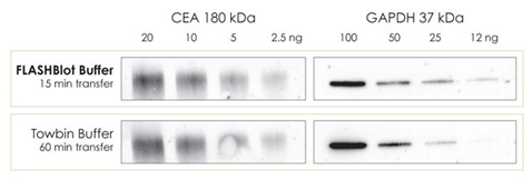 FLASHBlot緩沖液轉(zhuǎn)印15min即可達(dá)到Towbin緩沖液轉(zhuǎn)印60min的效果,甚至更好。