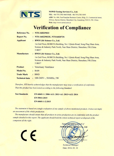 2016年3月10日,瑞沃德生命科技自主研發(fā)的大動物呼吸機(型號:R409)收到歐盟CE認證檢測證書,標志著此款產(chǎn)品通過歐盟CE認證,可以在所有歐盟成員國中流通。