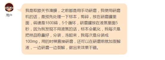 除了用戶們?cè)?/SPAN>“昊諾斯鼎昊源組織研磨分享”群內(nèi)進(jìn)行了熱烈的分享、討論之外,我們還邀請(qǐng)了一位老用戶進(jìn)行組織研磨實(shí)驗(yàn)的分享,內(nèi)容很精彩,在此表示感謝!以下是我們的這位老用戶的部分分享內(nèi)容: