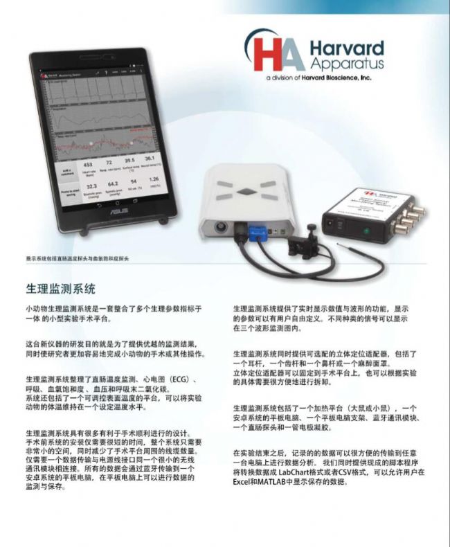 美國(guó)Harvard推出新產(chǎn)品-平板式小動(dòng)物生理監(jiān)測(cè)系統(tǒng)。小動(dòng)物生理監(jiān)測(cè)系統(tǒng)是一套整合了多個(gè)生理參數(shù)指標(biāo)于一體的小型實(shí)驗(yàn)手術(shù)平臺(tái)。這臺(tái)新儀器的研發(fā)目的就是為了提供優(yōu)越的監(jiān)測(cè)結(jié)果,同時(shí)使研究者更加容易地完成小動(dòng)物的手術(shù)或其他操作。