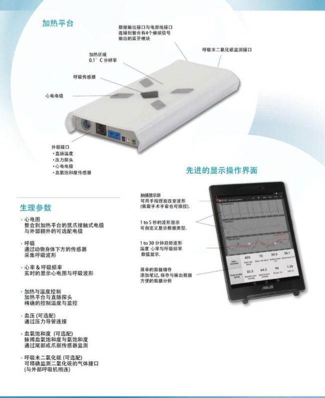 生理監(jiān)測(cè)系統(tǒng)整理了直腸溫度監(jiān)測(cè)、心電圖(ECG)、呼吸、血?dú)怙柡投取⒀獕汉秃粑┒趸。系統(tǒng)還包括了一個(gè)可調(diào)控表面溫度的平臺(tái),可以將實(shí)驗(yàn)動(dòng)物的體溫維持在一個(gè)設(shè)定溫度水平。