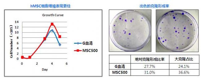 篩選標準:hMSC增殖傳代至少6次,依科賽間充質(zhì)干細胞專用血清(貨號MSC500)顯示出與對照血清具有相當或更好的倍增時間,以及更為出色的克隆形成率。