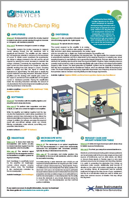 您是否是膜片鉗操作專家?對于初學(xué)者來說操作一堆膜片鉗裝置令人卻步,這里我們通過這樣簡化的的信息圖示方式,詳細(xì)介紹了各種組成裝置的在膜片鉗系統(tǒng)中的重要作用。