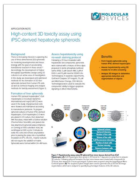 培養(yǎng)、評價和分析3D細(xì)胞球進(jìn)行體外高通量篩選,我們使用優(yōu)化的定量的高通量方法對3D培養(yǎng)的iPSC誘導(dǎo)的肝細(xì)胞球進(jìn)行肝毒性研究。