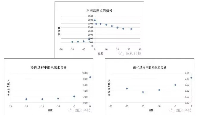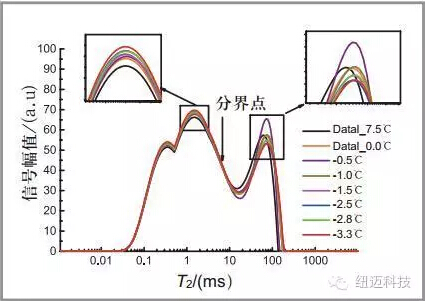 溫度降低,水逐漸結(jié)成冰,冰的信號在核磁中不顯示,根據(jù)NMR信號強(qiáng)度的減小換算未凍水含量。 |
