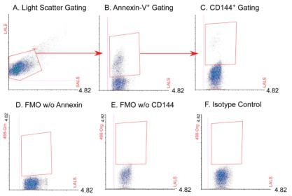 圖A,散射光檢測微粒群圈門;圖B, Annexin-V+微粒群圈門;圖C,Annexin-V+和CD144+微粒圈門;圖D,Annexin-V熒光染料對照背景圈門;圖E,CD144熒光染料對照背景圈門;圖F,CD144抗體同型對照背景圈門。
