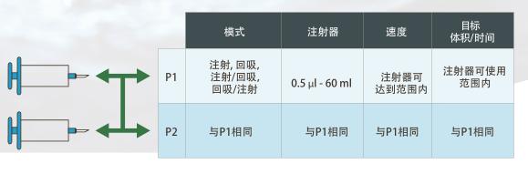 獨立運行方式允許PUMP33 DDS 像兩臺獨立的注射泵一樣運行,系統(tǒng)中以P1和P2來命名,每一臺泵都可以獨立運行,使用不同類型和尺寸的注射器,設(shè)定不同的推力,不同的目標(體積或時間)。