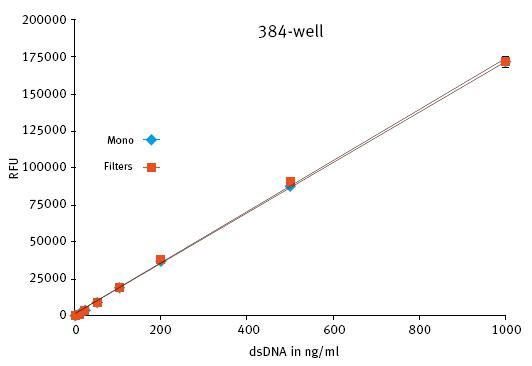 圖3: LVis微量板PicoGreen分析法,采用濾光片(紅色)和LVF光柵(藍(lán)色)的結(jié)果對比圖,樣品體積2μL