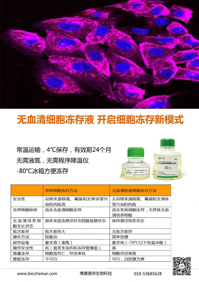 為感謝廣大用戶的支持和信賴,北京博康美華生物科技有限公司現(xiàn)推出無血清細(xì)胞凍存液促銷活動,買150ml送50ml,買500ml送150ml!