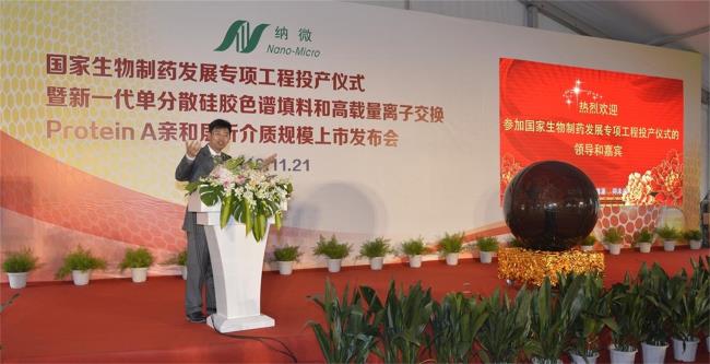 2016年11月21日,國(guó)家生物制藥發(fā)展專項(xiàng)工程投產(chǎn)儀式暨納微新品發(fā)布會(huì)在納微科技新廠區(qū)舉行。蘇州納微科技有限公司在活動(dòng)期間發(fā)布了被譽(yù)為世界第三代技術(shù)產(chǎn)品的單分散硅膠色譜填料和高載量離子交換、Protein A親和層析介質(zhì),宣布“蛋白類生物藥新型分離純化介質(zhì)產(chǎn)業(yè)化能力建設(shè)”項(xiàng)目成功實(shí)施。納微公司的董事長(zhǎng)江必旺博士、副總經(jīng)理邵宏偉、中科院院士張玉奎、中科院遺傳所高級(jí)工程師姜韜、蘇州工業(yè)園區(qū)科信局副局長(zhǎng)虞吉強(qiáng)以及蘇州納米城總裁張希軍出席此次活動(dòng)并致辭,數(shù)十家生物制藥及色譜企業(yè)代表及媒體記者參加此次會(huì)議,歡聚一堂,共同見證中國(guó)生物制藥分離純化核心材料從空白走向世界領(lǐng)先的歷史性時(shí)刻。