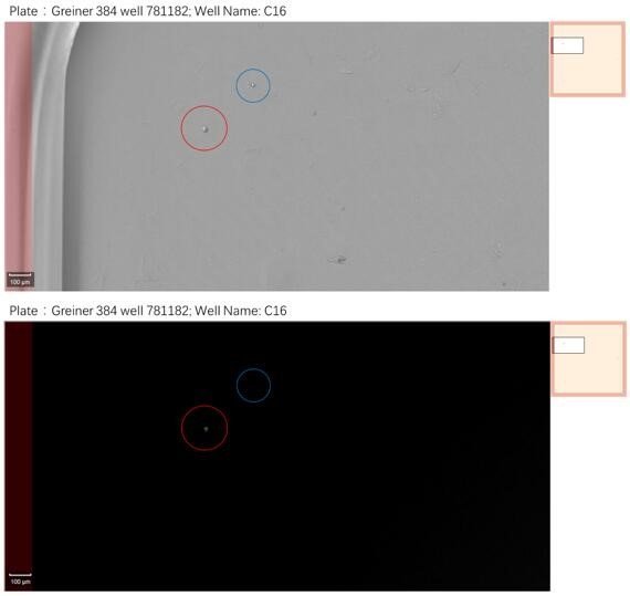 圖1:CloneSelect Imager FL的白光成像(上)和熒光成像(下)。借助熒光數(shù)據(jù),可以更可信地區(qū)分活細(xì)胞、死細(xì)胞和雜質(zhì),且軟件可以快速定位細(xì)胞的位置,方便數(shù)據(jù)分析。