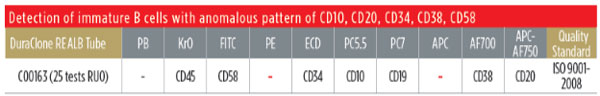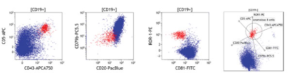 貝克曼庫爾特聯(lián)合該領(lǐng)域的權(quán)威專家,對血液疾。ū热鏐淋巴細(xì)胞性白血病、多發(fā)性骨髓瘤)臨床研究中用于稀有細(xì)胞流式檢測的靈敏抗體進(jìn)行優(yōu)化,推出了現(xiàn)在的DuraClone RE§管。該方案一共包含三個獨(dú)立panel,可以對B細(xì)胞發(fā)育分化的不同階段中含量極少的異常細(xì)胞進(jìn)行檢測,B80393針對成熟B淋巴異常細(xì)胞,含有ROR-1抗體,被認(rèn)為是區(qū)分慢淋和正常B細(xì)胞以及套白MCL的一個全新標(biāo)志物。B80394針對漿細(xì)胞中異常細(xì)胞。C00163針對未成熟B細(xì)胞中的異常細(xì)胞。三個方案均留有開放通道允許外加抗體或染料如核染色SYTO41,滿足研究靈活便利的需要。