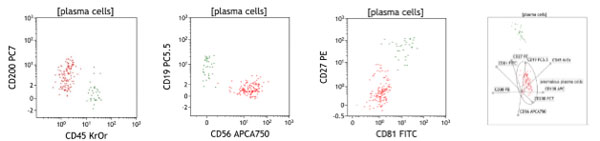 2,660,000個CD45+細(xì)胞數(shù)據(jù)分析示例。異常漿細(xì)胞群以紅點(diǎn)表示(52個,0.003% CD45+),正常漿細(xì)胞群以綠點(diǎn)表示(30個)。Kaluza§雷達(dá)圖通過全部8個參數(shù)CD45、CD38、CD138、CD19、CD56、CD200、CD81和CD27的多元視角確定了布爾設(shè)門策略。數(shù)據(jù)由Navios流式細(xì)胞儀分析全血樣品獲得。