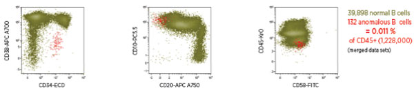 1,228,000個CD45+細(xì)胞數(shù)據(jù)分析示例。異常漿細(xì)胞群以紅點(diǎn)表示(132個,0.011% CD45+),正常B細(xì)胞群以綠點(diǎn)表示(39,898個)。結(jié)合采用CD58、CD34、CD10、CD38、CD20分析異常細(xì)胞。數(shù)據(jù)由Navios流式細(xì)胞儀分析全血樣品獲得。