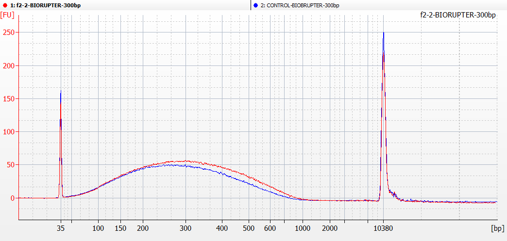 試用結(jié)果:樣品品質(zhì)良好,超聲效果理想。三個(gè)樣品由于實(shí)際濃度有差別,所以波峰有高低。總體上波峰稍稍拖后。Pico儀器是市面上唯一一款60KHz的超聲波破碎儀,片段極限在70bp。熟悉DNA打斷實(shí)驗(yàn)的都知道,目的片段越小、濃度越高越難處理。之前在新培晶試用時(shí),由于濃度太高(50 ng/µl),導(dǎo)致超聲時(shí)間過長(zhǎng),效果一般。鏈接:http://www.boyibio.cn/news/html/?89.html