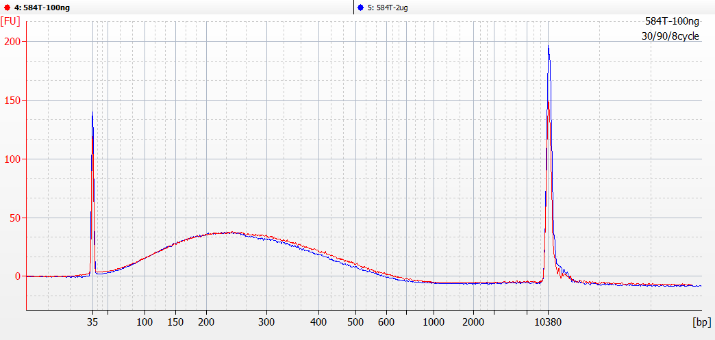 試用結(jié)果:樣品品質(zhì)良好,超聲效果理想。波峰明顯小于1kb,超聲循環(huán)數(shù)需要減少1-2個(gè)循環(huán)。