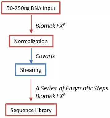 研究人員將獲得的50-250 ng DNA先使用Biomek FXp自動(dòng)化工作站進(jìn)行濃度均一化在55uL 的TE緩沖液中,然后使用Covaris進(jìn)行片段化。之后,再在Biomek FXp上進(jìn)行一系列的酶反應(yīng)及純化,包括片段化、末端修復(fù)、加A堿基、接頭連接和PCR富集等(Kapa Biosystems),以獲得高質(zhì)量的測(cè)序文庫。