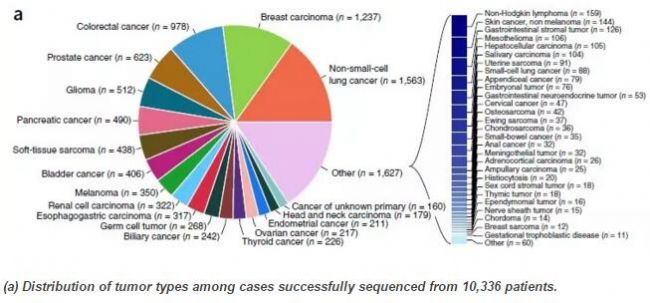 此研究是基于MSK-IMPACT (Integrated Mutation Profiling of Actionable Cancer Targets)測(cè)序技術(shù)進(jìn)行的,這是一種更靈活和全面的新型癌癥測(cè)序技術(shù),不僅適合當(dāng)前大部分腫瘤類型,而且還能夠檢測(cè)罕見的突變以及其他關(guān)鍵的遺傳變異。MSK-IMPACT是以二代測(cè)序(NGS)為基礎(chǔ),并結(jié)合癌癥基因的研究,選擇了341個(gè)關(guān)鍵的“癌基因”。研究人員通過對(duì)癌癥患者的這些“癌基因”區(qū)域測(cè)序,可以檢測(cè)到相關(guān)蛋白編碼區(qū)突變、拷貝數(shù)突變、啟動(dòng)子突變和基因重排等基因突變。