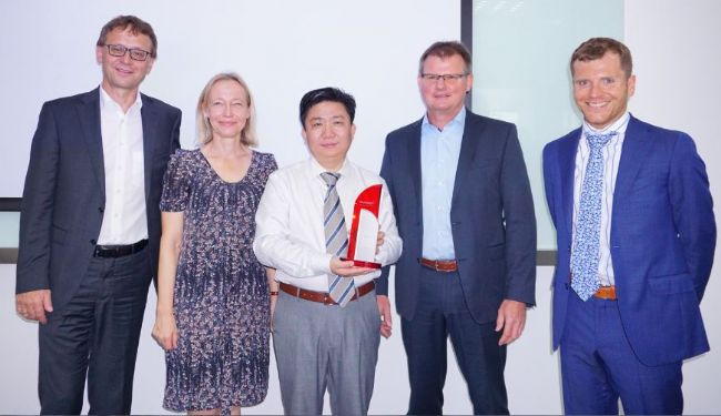 隨后,美墨爾特(Memmert)德國總部向美墨爾特(上海)貿(mào)易有限公司贈(zèng)送了頗具寓意的德國民族特色禮品——手工金箔畫,祝福創(chuàng)立于虎年的美墨爾特(上海)能夠如猛虎般活潑矯健,富有力量,持續(xù)為公司發(fā)展注入活力。Karpa女士向美墨爾特(上海)貿(mào)易有限公司董事總經(jīng)理穆先銀頒發(fā)了杰出貢獻(xiàn)獎(jiǎng)杯,以嘉獎(jiǎng)穆總對(duì)公司運(yùn)營及品牌拓展等方面所作出貢獻(xiàn)。