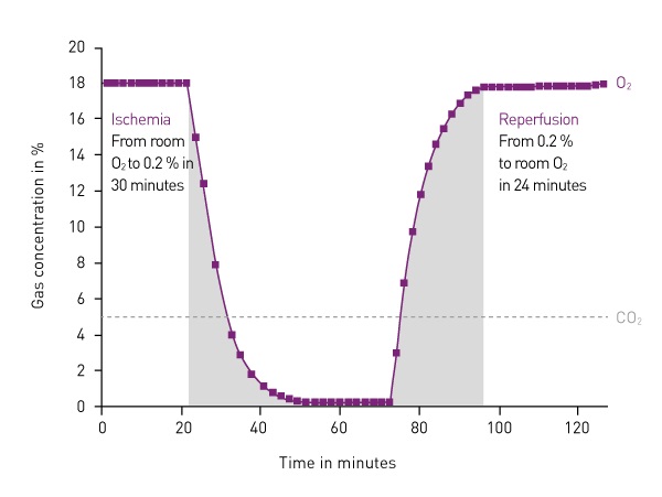 缺氧和缺血再灌注往往與致命性疾病相關(guān)聯(lián),例如中風(fēng)、心肌梗塞、休克、動(dòng)脈粥樣硬化和癌癥等疾病都能引起供血受阻從而導(dǎo)致氧氣(O2)和營(yíng)養(yǎng)供應(yīng)的減少。在體外對(duì)這些改變的研究,需要一種快速自動(dòng)控制氣體環(huán)境的功能,以實(shí)現(xiàn)自動(dòng)建立病理環(huán)境(缺氧以及自動(dòng)恢復(fù)/再灌注),并同時(shí)對(duì)其它生物指標(biāo)進(jìn)行實(shí)時(shí)檢測(cè)。