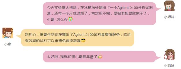 Agilent試劑耗材保質(zhì)期6-8個月,相信很多人都有小師妹一樣的困擾,伯豪生物作為Agilent PLUF系列耗材全國總代理,幫您解決困擾,臨期試劑免費更換嘍。!
