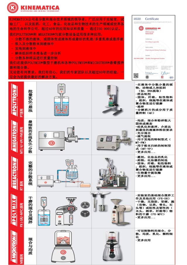 好消息!即日起,伯齊科技全新推出瑞士高端Kinematica研磨產(chǎn)品,不同系列的產(chǎn)品將會(huì)滿足您的不同需求,您的滿意是我們的最終目標(biāo)。 Kinematica品牌由定轉(zhuǎn)子分散技術(shù)之父---Willems教授在瑞士創(chuàng)立,擁有全球領(lǐng)先的分散、乳化、勻漿、均質(zhì)和研磨技術(shù),一直是這一技術(shù)領(lǐng)域的領(lǐng)導(dǎo)者。Kinematica利用其專利的轉(zhuǎn)子/定子原理,使均質(zhì)器通過降低固體顆粒,液滴和氣泡粒徑的尺寸,使其達(dá)到微米級(jí)或更低,以此來達(dá)到分散乳化或起泡的均質(zhì)效果。憑借四十多年的研發(fā),制造及應(yīng)用歷史,以及瑞士制造的優(yōu)良傳統(tǒng),Kinematica可提供從實(shí)驗(yàn)室到中試、產(chǎn)業(yè),從標(biāo)準(zhǔn)到定制的各種樣品處理解決方案。 | ||