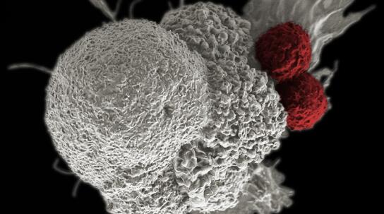 T細(xì)胞 (紅色) 正在攻擊癌細(xì)胞 (白色)。此項新技術(shù)可用于降低T細(xì)胞免疫治療的毒副作用。| NIH圖庫/ CC BY-NC 2.0