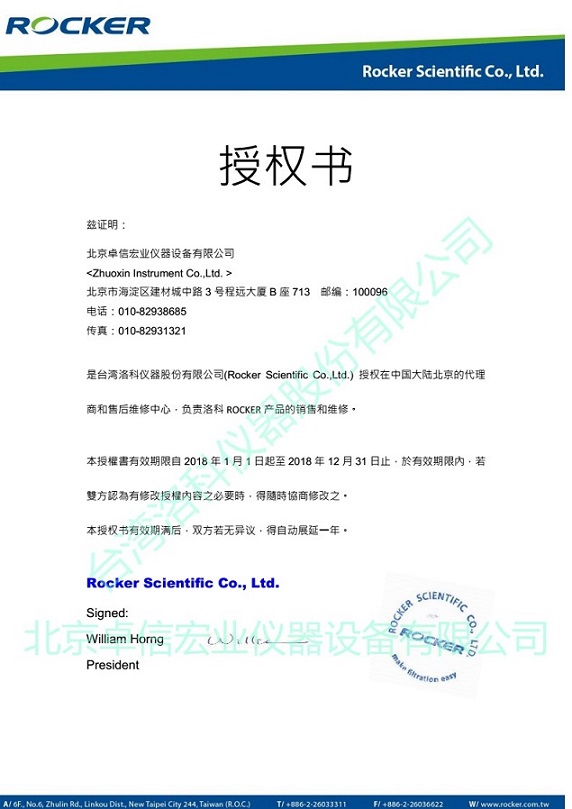尊敬的客戶和各位同行,北京卓信宏業(yè)儀器設(shè)備有限公司成為臺(tái)灣洛科股份有限公司北京辦事處,以下為授權(quán)協(xié)議,如有任何疑問(wèn)歡迎登錄臺(tái)灣洛科股份有限公司網(wǎng)站:http://www.rocker.com.tw,或通過(guò) 郵件:Gordon@rocker.com.tw 電話:886-2-26033311 聯(lián)系 洪先生 進(jìn)行咨詢。