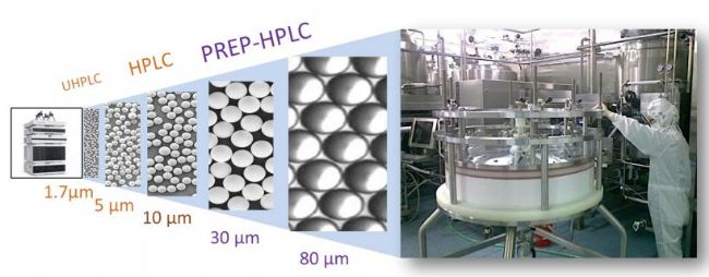 具體來說,色譜“芯”通常是指具有納米孔道結(jié)構(gòu)的微球材料,其粒徑在微米尺度范圍,跟頭發(fā)絲的直徑大小在同一個數(shù)量級,而色譜填料上面的孔徑,則是以納米衡量,大小在5-100納米范圍,是微球直徑的千分之一。由于色譜芯孔道小,因此具有極高比表面(1克色譜芯材料比表面積相當(dāng)于足球場那么大)。為了滿足其選擇性吸附和分離性能要求,微球表面還需要偶聯(lián)一些特殊功能配基,使其具有選擇性吸附和分離目標(biāo)分子功能。用于生物制藥分離純化或?qū)嶒炇曳治鰴z測的色譜芯,制備要求極高,商業(yè)價值大、技術(shù)難度大,需要整合當(dāng)今世界多個前沿領(lǐng)域的交叉技術(shù),涵蓋材料、化學(xué)、物理、和生物多個領(lǐng)域。目前,世界上只有少數(shù)幾家歐美和日本公司具備色譜芯規(guī);a(chǎn)能力,基本壟斷了包括用于分析檢測和生物分離純化的色譜“芯”材料,及其用色譜“芯”組裝成的色譜柱。