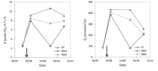 ET:100%滿足水分需求;RDI 1 :調(diào)虧灌溉,水分供給降低到37%;RDI 2:調(diào)虧灌溉,水分供給降低到50%。箭頭指向水分脅迫開始施加的日期。