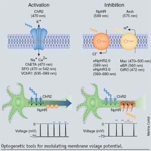背景: 光遺傳技術(shù)(optogenetics)2010年被《Nature Methods》評為年度技術(shù),這一技術(shù)工具在神經(jīng)科學、以及細胞生物學信號通路研究方面具有革命性的促進作用。光遺傳實驗中,在感興趣的能調(diào)控電信號的靶細胞上表達來自視蛋白的光學門控通道(light-gated ion channels),比如視紫紅質(zhì)通道蛋白2(channel rhodopsin-2,ChR2)或嗜鹽菌紫質(zhì)(halorhodopsin)等視蛋白,再分別利用藍光或黃光來激活(去極化)或抑制(超級化)經(jīng)過遺傳改造的神經(jīng)元細胞。