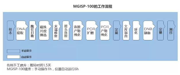 作為一款國產(chǎn)自動化產(chǎn)品,MGISP-100可替代人工完成核酸提取、PCR反應(yīng)、文庫構(gòu)建等一系列實(shí)驗(yàn)操作,適用于多個NGS應(yīng)用。以一個人的全基因組測序?yàn)槔?jīng)驗(yàn)豐富的實(shí)驗(yàn)人員手動建庫至少需要9個小時的周轉(zhuǎn)時間,而在使用MGISP-100之后,可以縮減至“手動1小時,自動6小時”。