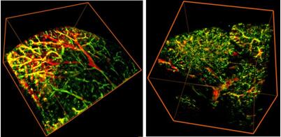 在血管生物學(xué)中的應(yīng)用,血管是生物體的重要組成部分,遍布全身,為生物組織提供維持生命所需的養(yǎng)分。任何生物組織的病變都會(huì)導(dǎo)致血管結(jié)構(gòu)及血管內(nèi)物質(zhì)成分的改變。因此,光柵掃描光聲成像技術(shù)應(yīng)用于生物醫(yī)學(xué)領(lǐng)域以來,大多都是致力于生物組織血管網(wǎng)絡(luò)的成像,包括從血管網(wǎng)絡(luò)的形態(tài)結(jié)構(gòu)到血氧飽和度、血液流速,以及組織代謝等的功能成像。