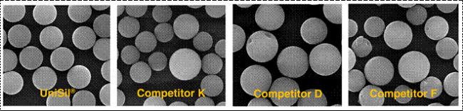 電鏡下呈現(xiàn)完美球形的單分散硅膠色譜填料--UniSil®與國(guó)際同行對(duì)比圖