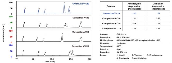 ChromCoreTM色譜柱結(jié)合了高純單分散多孔硅膠微球及先進(jìn)的表面鍵合技術(shù),極大地降低羥基活性,堿性化合物的峰型對(duì)稱性極佳