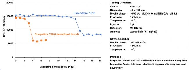 用100mM氫氧化鈉溶液每隔一小時(shí)沖洗一次,以考察乙酰苯胺色譜峰的保留時(shí)間、柱效和峰對(duì)稱性的變化情況;ChromCoreTM色譜柱的堿耐受性較國(guó)際知名品牌有較大優(yōu)勢(shì)