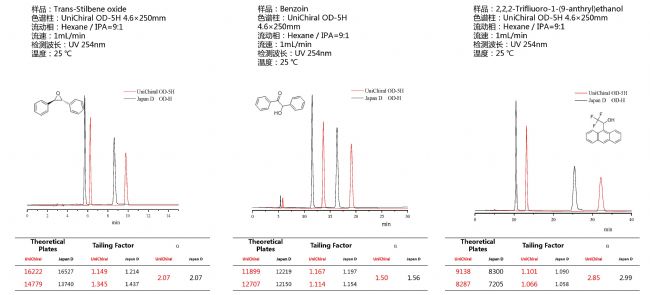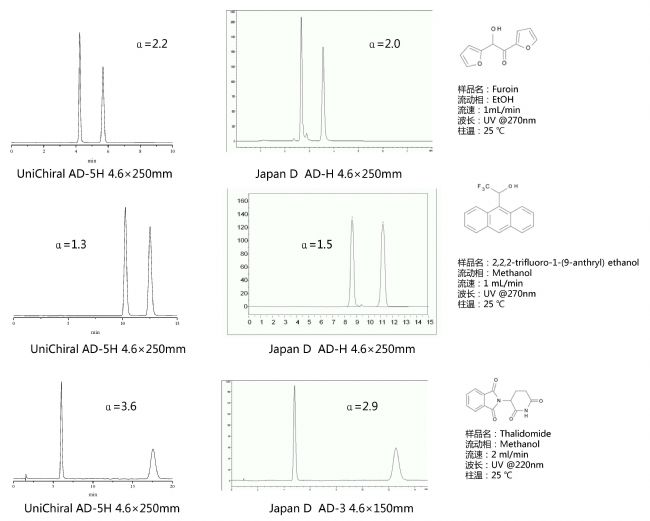 與進(jìn)口直鏈淀粉手性產(chǎn)品相比,基于單分散硅膠的UniChiral®直鏈淀粉手性柱,選擇性相似、峰型對(duì)稱度較好