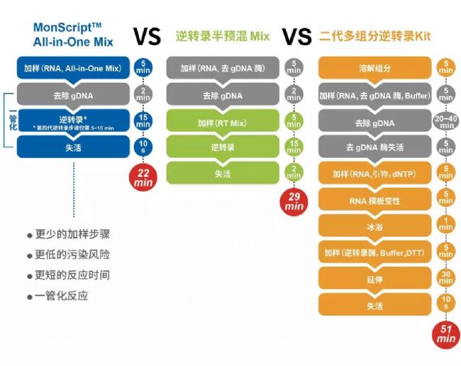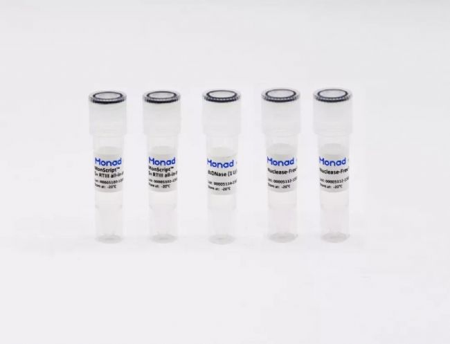 ▪ MonScript™ RTIII All-in-One Mix (with dsDNase) 是針對(duì)一鏈 cDNA 合成開發(fā)出的一個(gè)操作更為簡便的系統(tǒng),包含所有一鏈 cDNA 合成反應(yīng)所需組分,反應(yīng)中僅需加入 RNA 模板和水。預(yù)混液中的逆轉(zhuǎn)錄酶是MonScript™ RTase III(REF: RN05002),該酶去除了 RNase H活性,最高反應(yīng)溫度為 55℃,大幅提升了逆轉(zhuǎn)錄效率和對(duì)復(fù)雜模板(高 GC 比例或大量二級(jí)結(jié)構(gòu))的耐受性,特異性更好、產(chǎn)率更高、更容易獲得全長 cDNA。該試劑盒中包含了dsDNase,能夠徹底去除基因組 DNA 污染,保證下游定量結(jié)果的真實(shí)可靠。