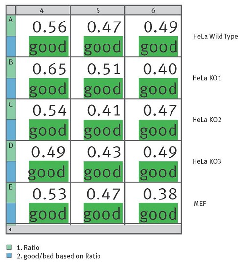 判斷樣本是否有支原體污染通過計(jì)算MycoAlert的比率來判斷。CLARIOstar酶標(biāo)儀自帶的分析軟件MARS,自動(dòng)計(jì)算MycoAlert的比率,并且自動(dòng)顯示每個(gè)樣本是好是壞,樣本是否有支原體污染一目了然。