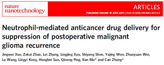 2017年中國藥科大學(xué)張燦教授課題組在Nature Nanotechnology雜志(影響因子38.986)上發(fā)表論文,借助脂質(zhì)體納米載體,使用中性粒細(xì)胞治療與化療藥物紫杉醇(Paclitaxel, PTX)聯(lián)合治療腦膠質(zhì)瘤,實(shí)現(xiàn)了高效自主引導(dǎo)的藥物靶向遞送,對原位腦膠質(zhì)瘤小鼠模型術(shù)后的復(fù)發(fā)起到顯著抑制效果。