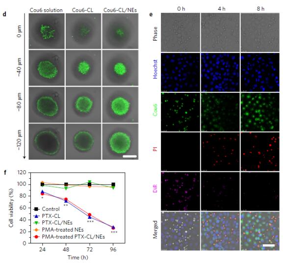 在3D膠質(zhì)瘤細(xì)胞模型上,使用Cou6探針(綠色)標(biāo)記脂質(zhì)體納米顆粒,通過共聚焦光學(xué)切片觀察不同處理?xiàng)l件下的脂質(zhì)體對3D細(xì)胞的浸潤情況, Cou6-CL/NEs復(fù)合體組能更好的侵入3D腫瘤細(xì)胞微球內(nèi)部(上圖d)。在單層G422神經(jīng)膠質(zhì)瘤細(xì)胞模型上,通過Cou6探針(綠色)標(biāo)記脂質(zhì)體/DiR(紫色)標(biāo)記中性粒細(xì)胞/Hoechst(藍(lán)色)標(biāo)記所有細(xì)胞核/PI(紅色)標(biāo)記死細(xì)胞,通過顯微成像觀察不同處理時(shí)間點(diǎn),中性粒細(xì)胞釋放NETs及對G422膠質(zhì)瘤細(xì)胞的殺傷情況,隨著時(shí)間的推移,8小時(shí)后中性粒細(xì)胞釋放Cou6,且被G422細(xì)胞內(nèi)吞后造成細(xì)胞死亡(上圖e)。通過G422細(xì)胞存活實(shí)驗(yàn)進(jìn)一步驗(yàn)證,PMA處理的細(xì)胞制劑(PTX-CL/NEs)與PTX-CL具有相當(dāng)?shù)哪[瘤殺傷效果(上圖f)。