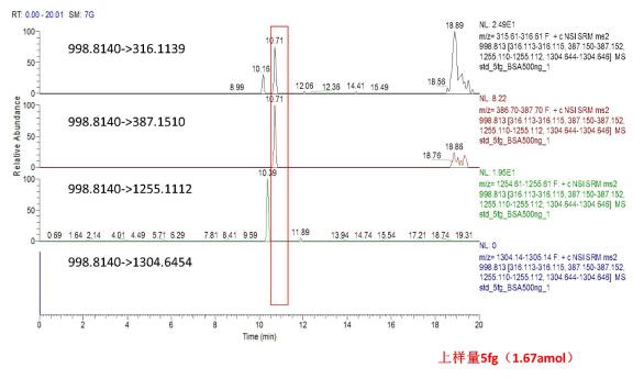 圖3 目標(biāo)肽段LOQ點(diǎn)的色譜圖(柱上5fg,即1.67amol)