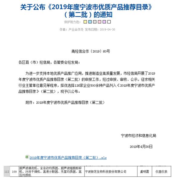 為了進(jìn)一步支持寧波市優(yōu)質(zhì)產(chǎn)品的推廣,推進(jìn)制造業(yè)高質(zhì)量發(fā)展,寧波市經(jīng)濟(jì)和信息化局在全市范圍內(nèi)開展2019年度寧波市優(yōu)質(zhì)產(chǎn)品評(píng)選活動(dòng)。寧波新芝生物各系列產(chǎn)品(超聲波清洗機(jī)、全自動(dòng)均質(zhì)器、超聲波細(xì)胞粉碎機(jī)、冷凍干燥機(jī)、高速分散器、無(wú)菌均質(zhì)器、高壓均質(zhì)機(jī))均被評(píng)為2019年度寧波市優(yōu)質(zhì)產(chǎn)品。