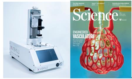 2019年,公司推出了世界上首款生物血管及微血管打印產(chǎn)品---Lumen X。Lumen X生物3D打印系統(tǒng),整合了LAB-ON-CHIP微流控技術(shù);用photography技術(shù)一次超過一百萬個光點,一次固化整個層,使結(jié)構(gòu)交聯(lián),速度比其他打印方法快50倍,這款產(chǎn)品是市面上最快的提供高分辨率、高通量和高保真度的生物3D打印——增強了在微流體、充滿細(xì)胞的水凝膠、大孔結(jié)構(gòu)等領(lǐng)域的應(yīng)用。Lumen X平臺是和發(fā)表Science封面文章的作者合作,研發(fā)出來的新打印設(shè)備,此設(shè)備可以成功地打印了功能性血管網(wǎng)絡(luò),并顯示出增強血管間轉(zhuǎn)運、營養(yǎng)物質(zhì)輸送、宿主植入等功能的巨大潛力。
