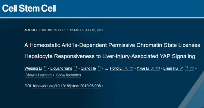 7月3日,國際學術期刊Cell Stem Cell 在線發(fā)表了題為A Homeostatic Arid1a-Dependent Permissive Chromatin State Licenses Hepatocyte Responsiveness to Liver-Injury-Associated YAP Signaling 的研究論文。該研究成果由中國科學院分子細胞科學卓越創(chuàng)新中心/生物化學與細胞生物學研究所惠利健組與中國科學院上海營養(yǎng)與健康研究所李亦學組合作完成。