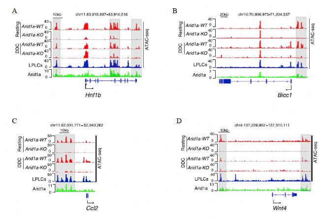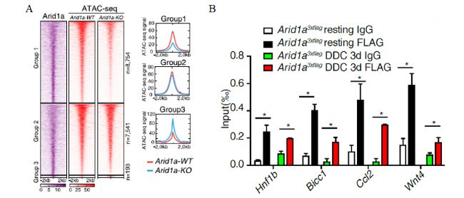 鑒于Arid1a是染色質(zhì)重塑復合體的重要組分,科研人員通過ATAC-seq技術研究染色質(zhì)開放區(qū)域。發(fā)現(xiàn)Arid1a蛋白可與LPLC相關基因(誘導肝祖細胞樣細胞產(chǎn)生)的增強子區(qū)域結合,維持該系列基因染色質(zhì)保持開放狀態(tài)。對靜息狀態(tài)下的Arid1a3xflag及喂食DDC造成肝損傷的Arid1a3xflag小鼠進行ChIP-qPCR分析,發(fā)現(xiàn):不管是靜息狀態(tài)還是肝損傷,Arid1a都可與LPLC相關基因結合。