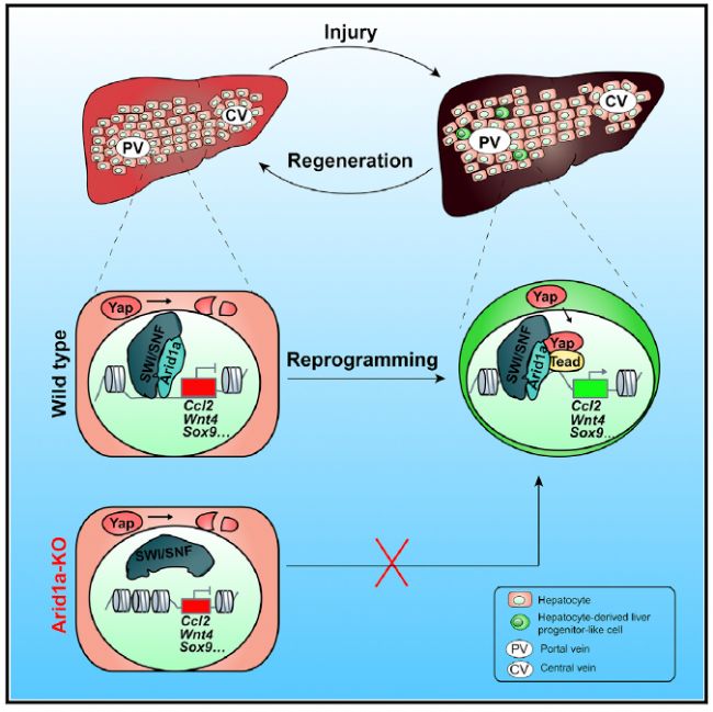研究發(fā)現(xiàn):染色體重塑調(diào)控蛋白Arid1a維持一系列與干性和再生相關基因染色質(zhì)呈開放的狀態(tài),當肝細胞受到損傷時,可幫助肝臟損傷活化的轉(zhuǎn)錄因子Yap入核,結合到染色質(zhì)呈開放狀態(tài)的靶基因上,激活肝細胞重編程相關基因的表達,進而促進肝細胞去分化的發(fā)生。